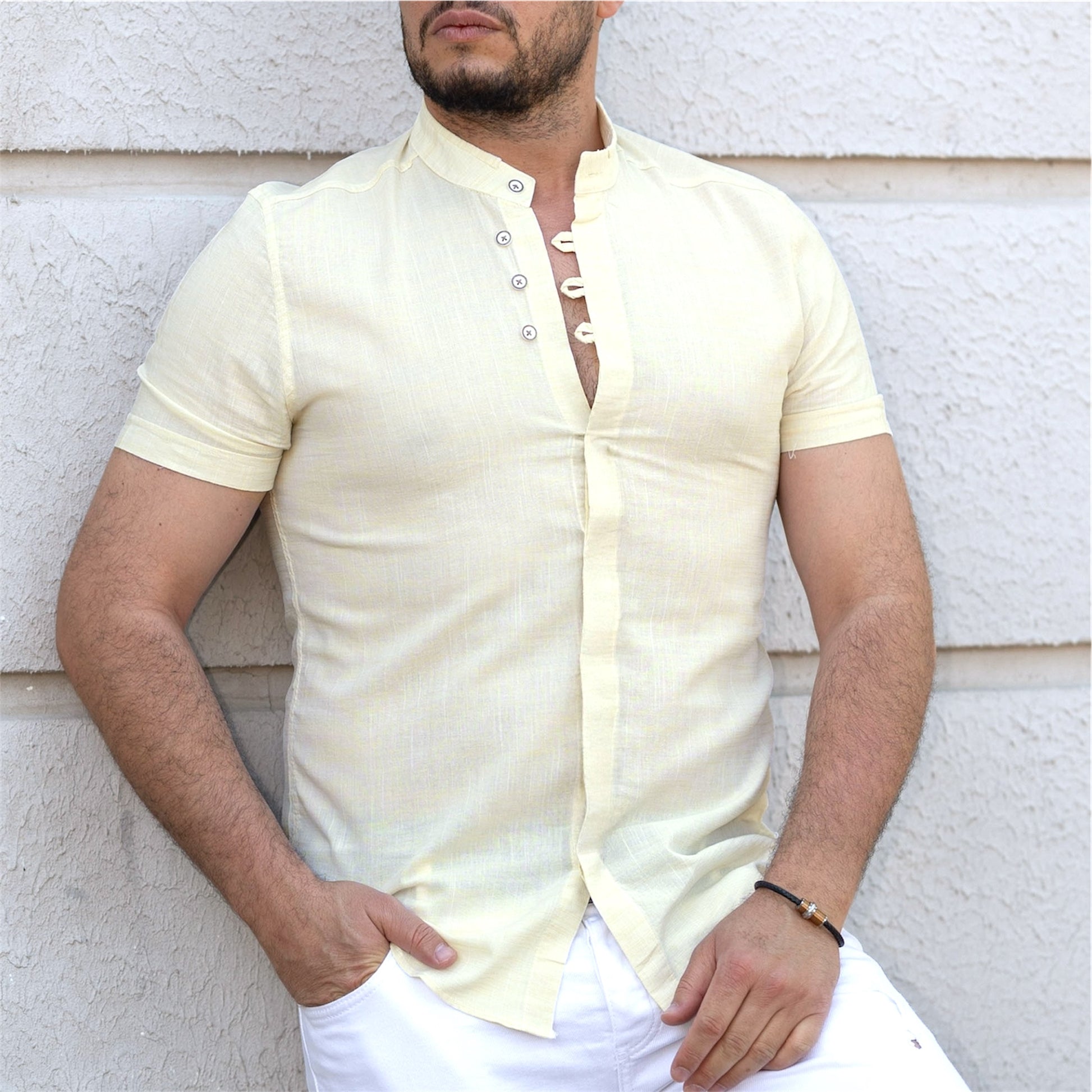 🔹 Комір: Чоловіча сорочка стійка , застібається на елегантний ґудзик